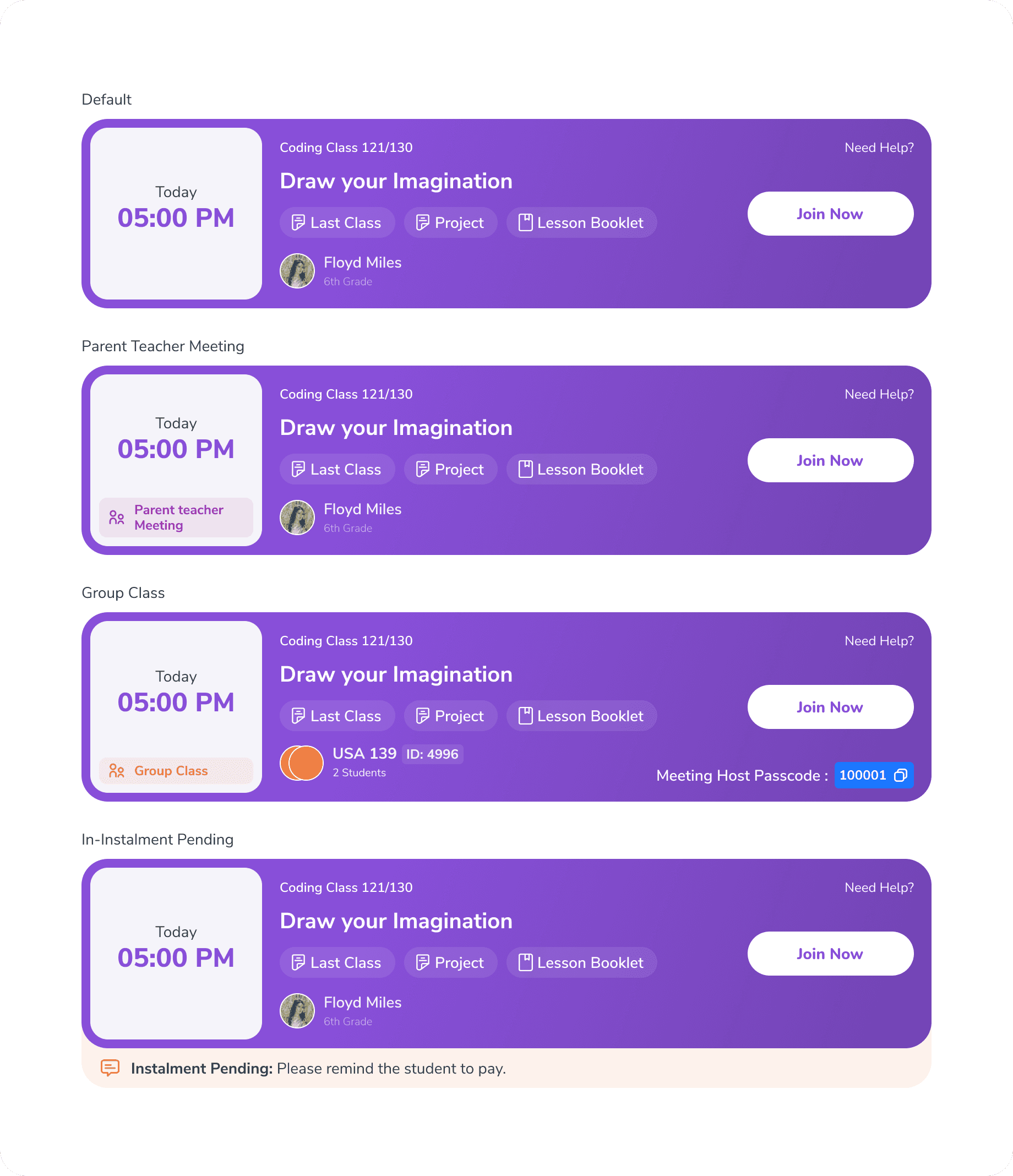 A prominent class joining card was placed at the top of the dashboard, clearly highlighting the next upcoming class.