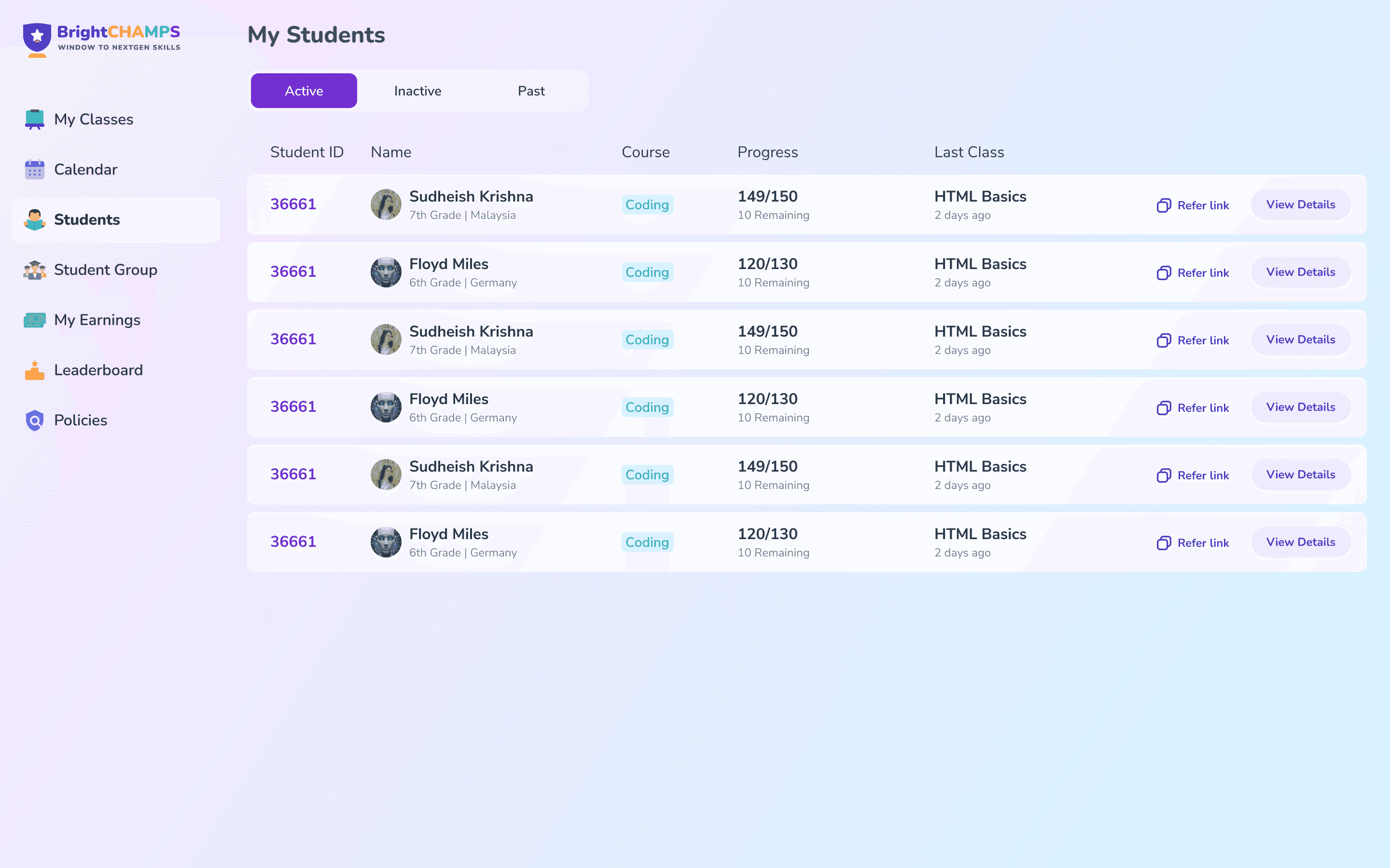 he student listing page was simplified to improve scanability and faster access to student context.